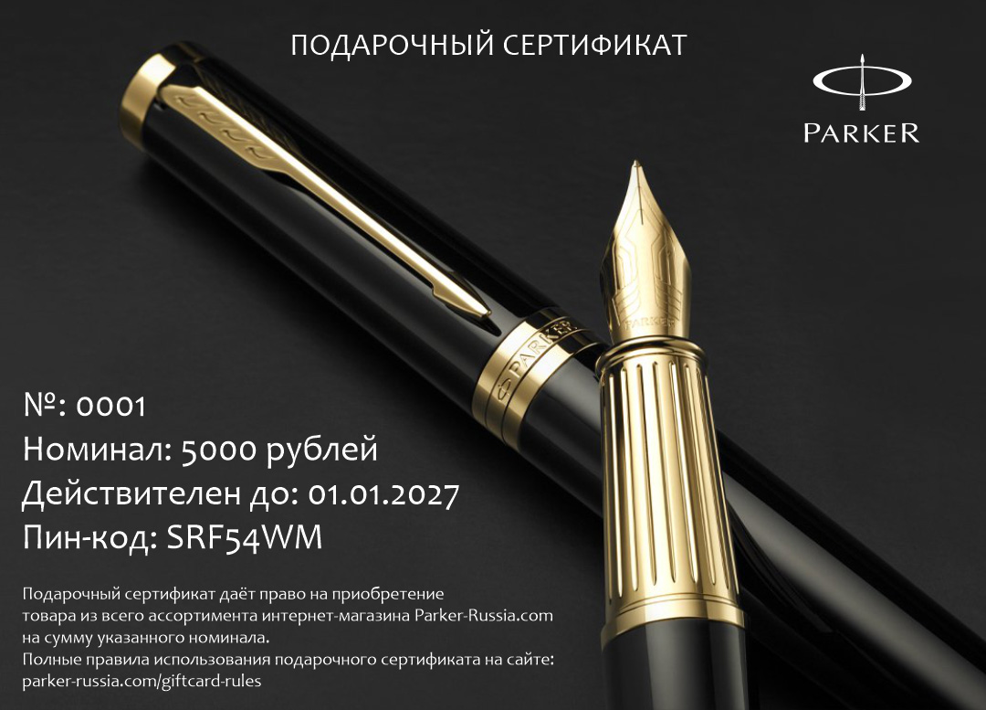 Подарочный сертификат Parker 7000 от официального дилера Parker в Набережных Челнах. Вы можете дополнительно заказать гравировку, которая подчеркнет Вашу оригинальность и придаст памятность статусному подарку. Все ручки Паркер поставляются в фирменном футляре.
